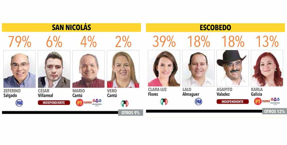 En el caso de Escobedo, la alcaldesa con licencia Clara Luz Flores (PRI) toma la ventaja con el 39% de la preferencia, colocándolo por delante de Lalo Almaguer (PAN), quien tuvo únicamente el 18%.