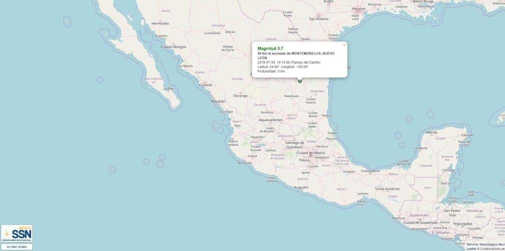 De acuerdo al Servicio Sismológico Nacional, este martes se registró un sismo con magnitud 3.7 grados en la escala de Richter a 40 kilómetros al Suroeste de Montemorelos. NL.