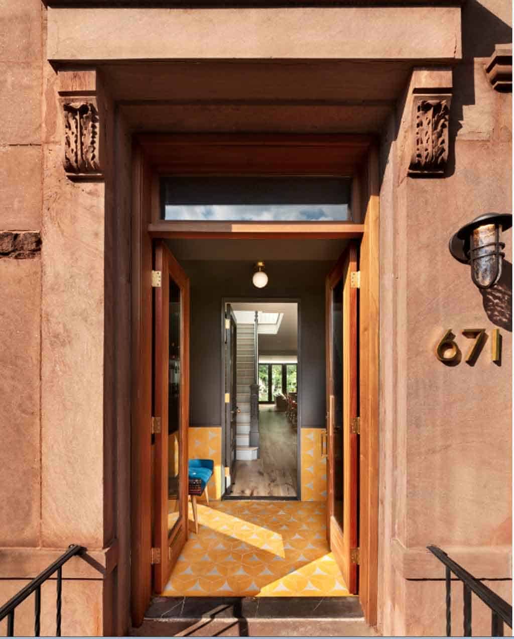 Ubicada en el barrio neoyorkino de Crown Heights, esta residencia de fachada rojiza se compone de elementos y piezas de carpintería con vívidos tratamientos de color tridimensionales que fueron puntuados por chimeneas y tragaluces para brindar una iluminación audaz. La firma de arquitectura BFDO Architects personalizó cada pieza de decoración para equilibrarlas entre los elementos de carpintería original. En la entrada, el diseño del vestíbulo se presenta como un punto focal, en este se mantuvo la puerta original pero se pintó de gris oscuro para contrastarla con las baldosas y accesorios.