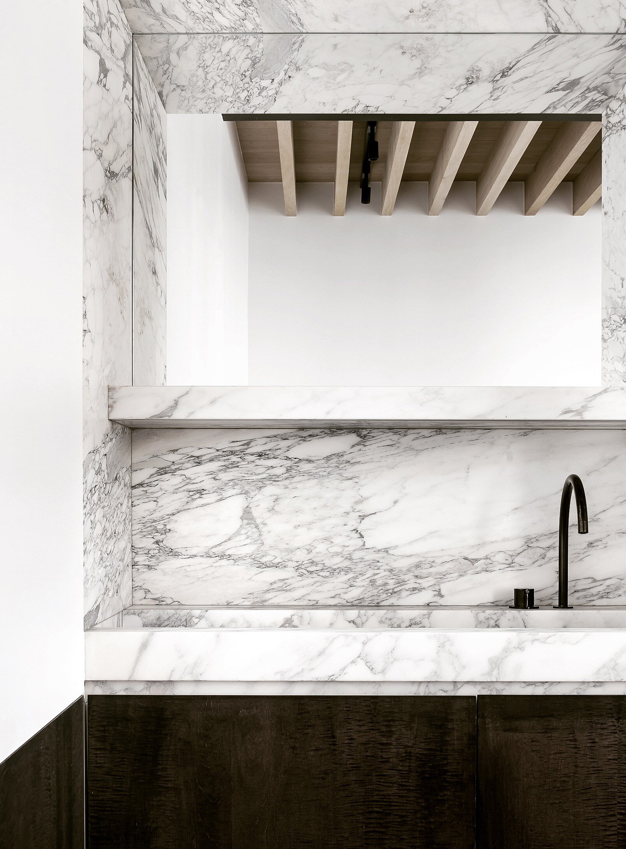 Mármol, granito, cuarcita, piedras preciosas, madera, cristal, concreto, azulejo o espejo; la variedad de opciones de materiales a echar mano podría resultar extensa. Usualmente, para la cubierta donde se empotra o reposa el lavabo buscamos un material resistente al agua en temas de mantenimiento, aunque por tratarse de un baño de poco uso, podríamos vernos osados y atrevernos a utilizar algún material no tan práctico en ese rubro, por puro placer, como mármol, madera o cristal, que sabemos requerirán de un mantenimiento o tratamiento distinto. Los granitos y cuarcitas resultan idóneos, pues son altamente resistentes a la humedad y su mantenimiento es fácil.